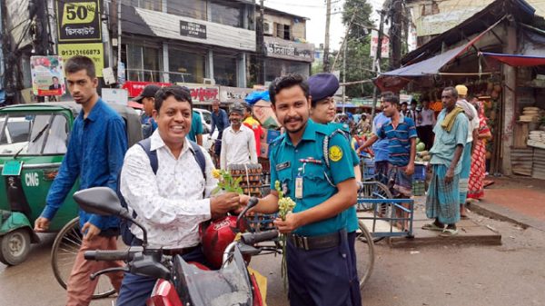 সিলেটের কথা ::: বৃহস্পতিবার দুপুরে সিলেটের হুমায়ুন রশীদ চত্বর এলাকায় ট্রাফিক আইন মানতে উদ্ভূদ্ধ করতে মোটর সাইকেল চালকদের ফুল দিয়ে শুভেচ্ছা জানান পুলিশ কমিশনার ব্যাটারি চালিত রিকশা মহানগর এলাকায় চলতে