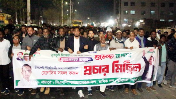 সিলেটের কথা ::: বিএনপির চেয়ারম্যান দেশনায়ক তারেক রহমানের পুণ্যভূমি সিলেটে আগমন এবং আলিয়া মাদ্রাসা মাঠে অনুষ্ঠিতব্য নির্বাচনী জনসভা সফল করার লক্ষ্যে সিলেটে বিশাল প্রচার মিছিল অনুষ্ঠিত হয়েছে। মঙ্গলবার রাতে সিলেট
